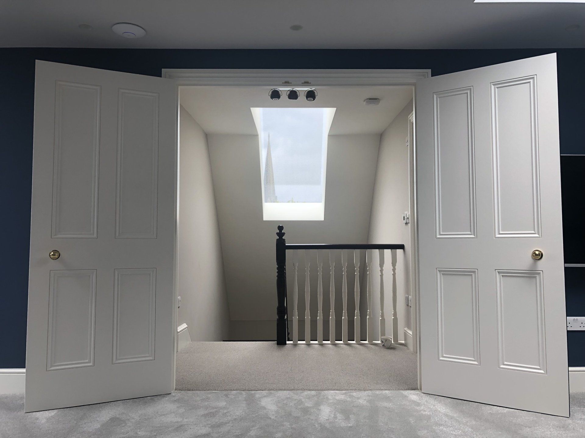 The existing ornate staircase was replicated in great detail, providing continuous circulation from top to bottom. As the staircase was going to cut of a lot of light to the rst-oor hallway, we proposed a second glazed intervention; a double pitched glass slot running along the landing and down the existing roof pitch.