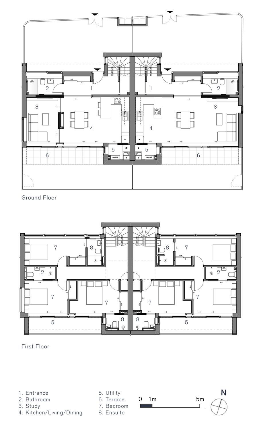 The final proposal offers four generously designed three-bedroom properties with extensive shared amenity space. To avoid imposing on neighbouring views and lighting, the height of the new build was reduced by excavating the ground floor, enabling a larger footprint without increased massing. Each home delivers contemporary living on a modest budget without compromising on quality or space. Passivhaus standards ensure reduced heating costs, while a sedum roof and the reuse of bricks from the existing garages elevate the sustainability of both construction and long-term use.