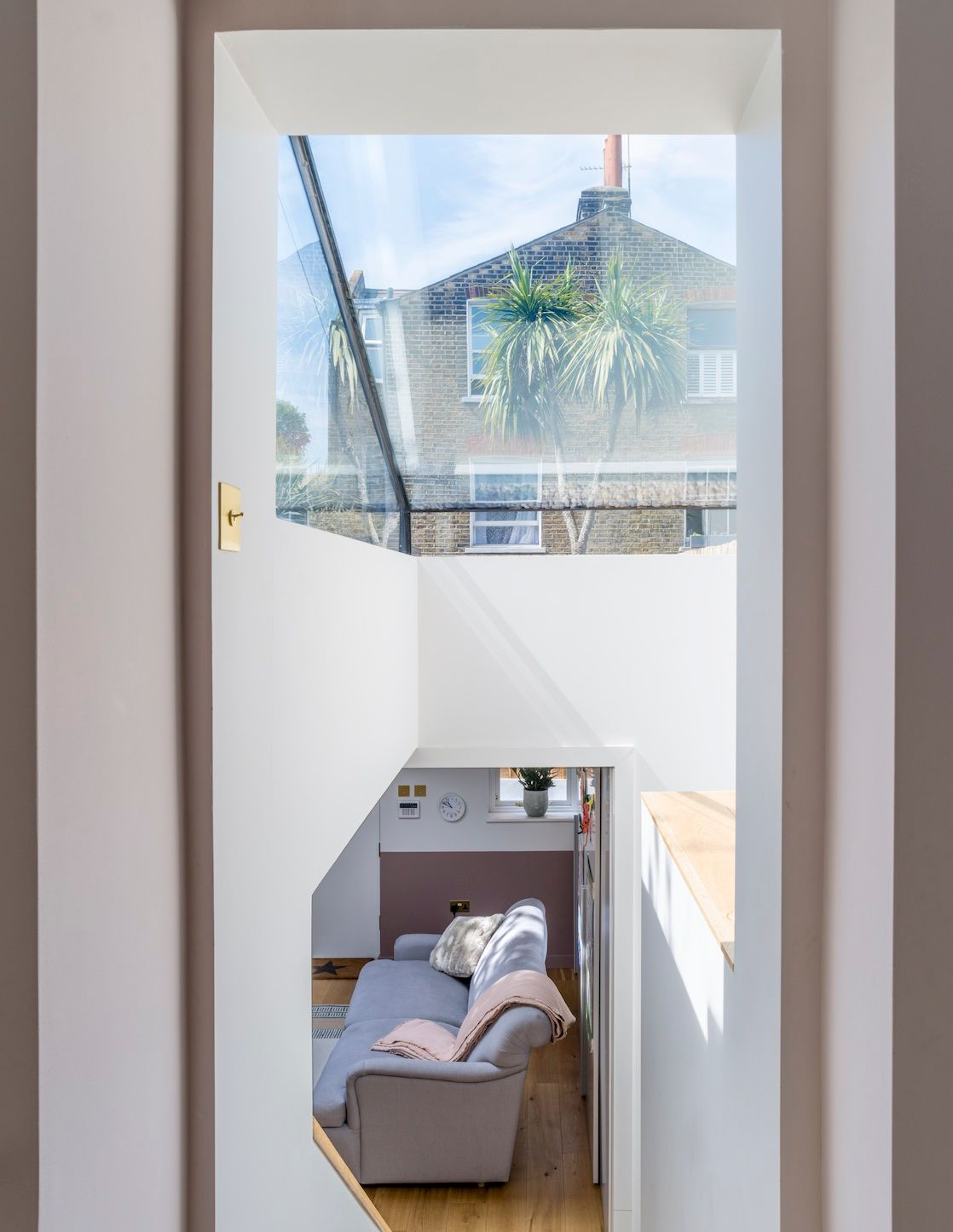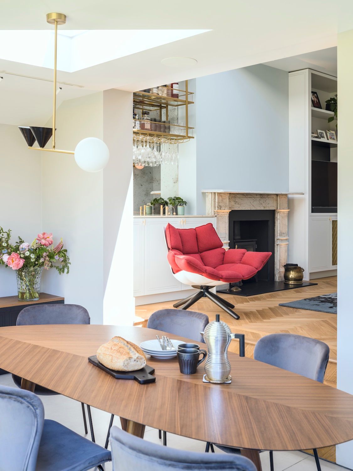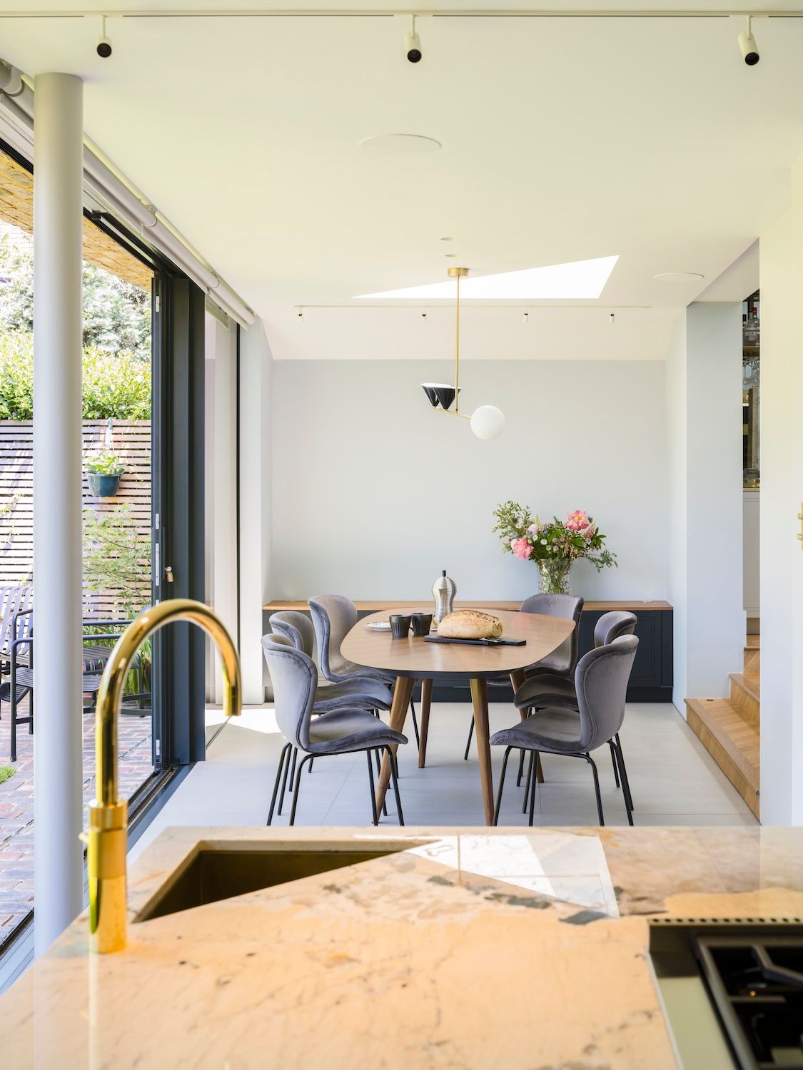 By extending the ground floor by 4 meters, the new kitchen/dining room now boasts ample natural light from new twin sliding doors and two triangular skylights.