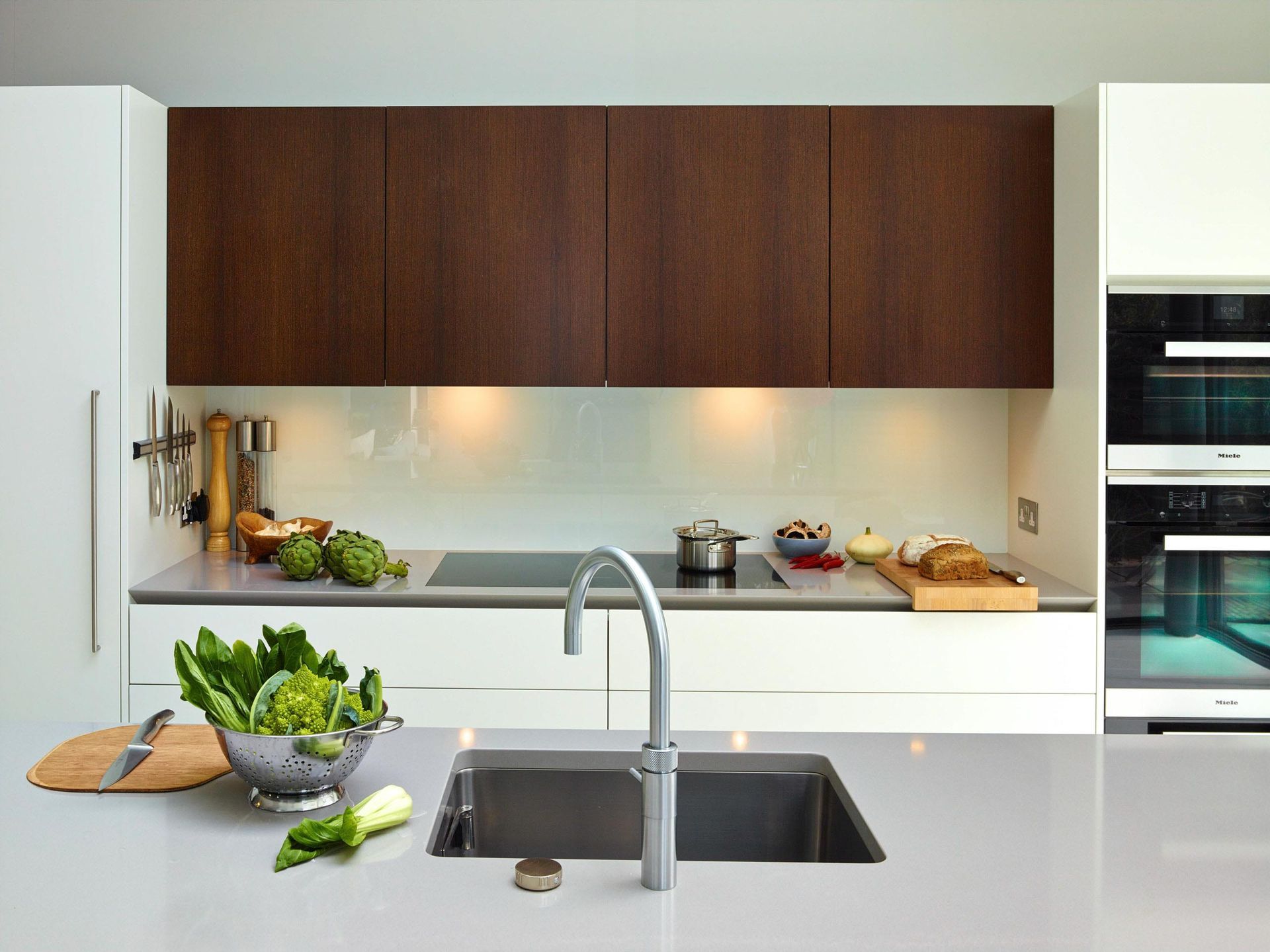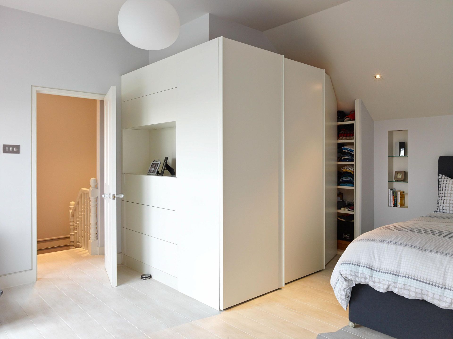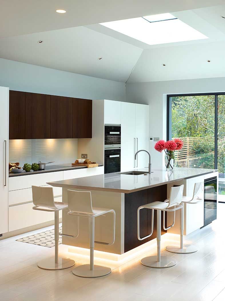 The Clients themselves wanted a simple modern, easy to clean house, where guests could visit them and live there on the first floor. The top floor (loft conversion) was reserved as a master suite for them. Velux balcony windows were installed as well as under floor heating and a new ensuite bathroom pod. Storage was important but it had to be hidden. Therefore, eaves storage drawers were put in and the bathroom was designed with a walk-in cupboard prior to this which was designed a storage pod.