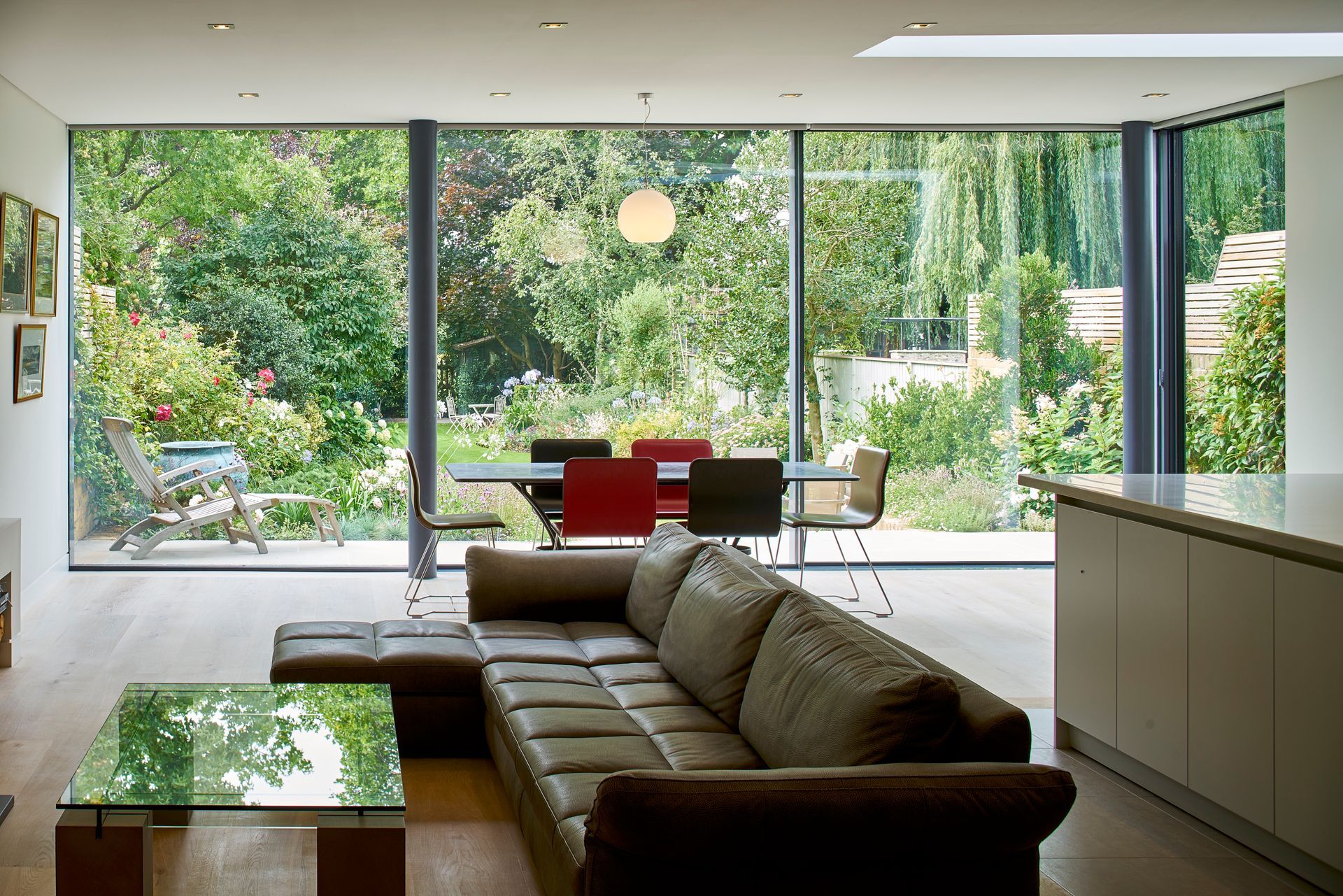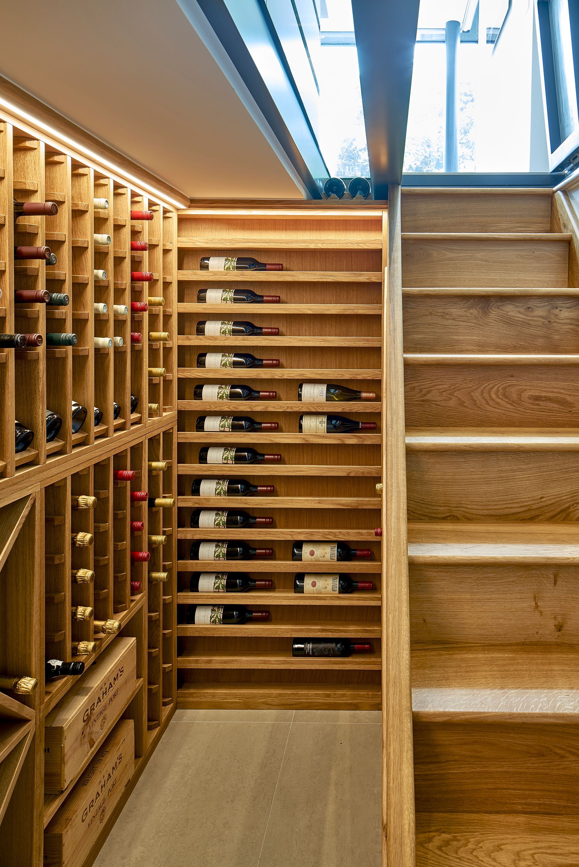 The new extensions incorporate clean lines and frameless sky lights; a sleek kitchen hides a pneumatic door in the floor, that opens to reveal a sunken bespoke wine cellar where once stood a dank basement.