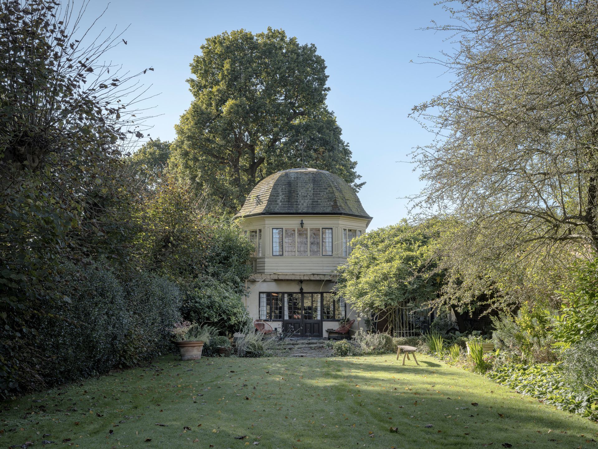 Originally built in the late 19th century as a Summer House for the owners of the estate the Pavilion resides on, it faced dereliction and even fire over the course of its history. The clients wanted to find a way to expand their home while adhering to strict historical limitations, enhancing the Pavilion’s unique features and maintaining harmony with the surrounding Grade II historic parkland. The core aim of this project was to meticulously restore the Pavilion while seamlessly integrating modern living spaces, cleverly concealed behind glass that reflects the surrounding pavilion and gardens. The bathroom and kitchen were relocated to a side and rear extension, discreetly separating the Pavilion from the new addition.