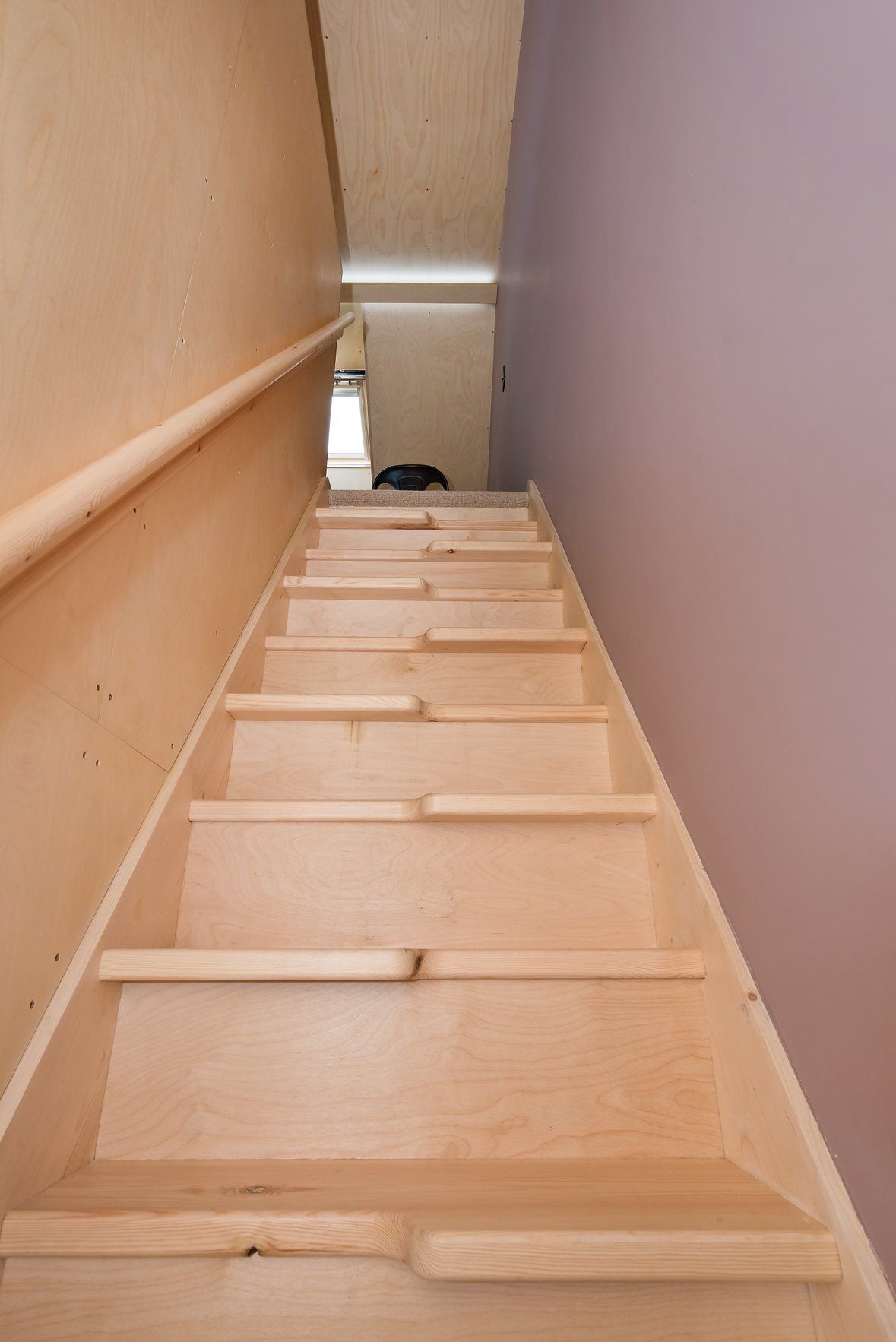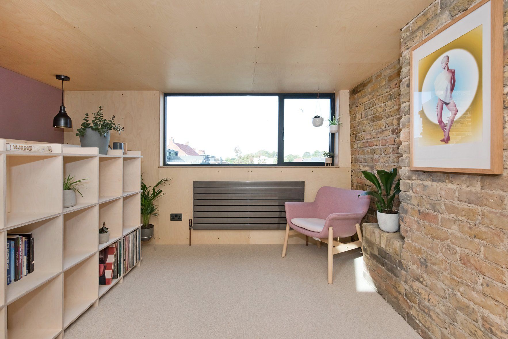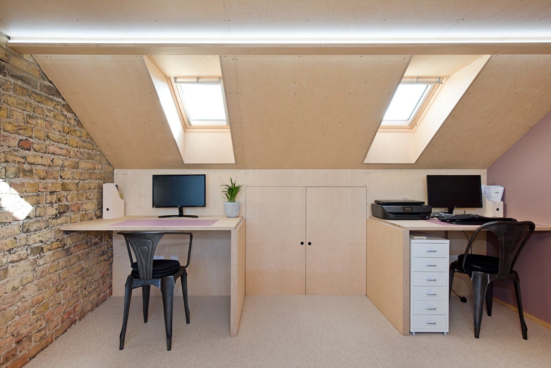 In order to realise the headroom for home office, we were able to reinforce the old ceiling joists without breaking the ceiling and successfully got planning permission to raise the ridge height. A pigeon staircase was fitted above the existing stair and the installation of a glass smoke screen on the ground floor enable us to avoid a new door. For the space itself, we designed a plywood clad room, exposing the brick gable where we could and designing in movable furniture, storage and concealed lighting.