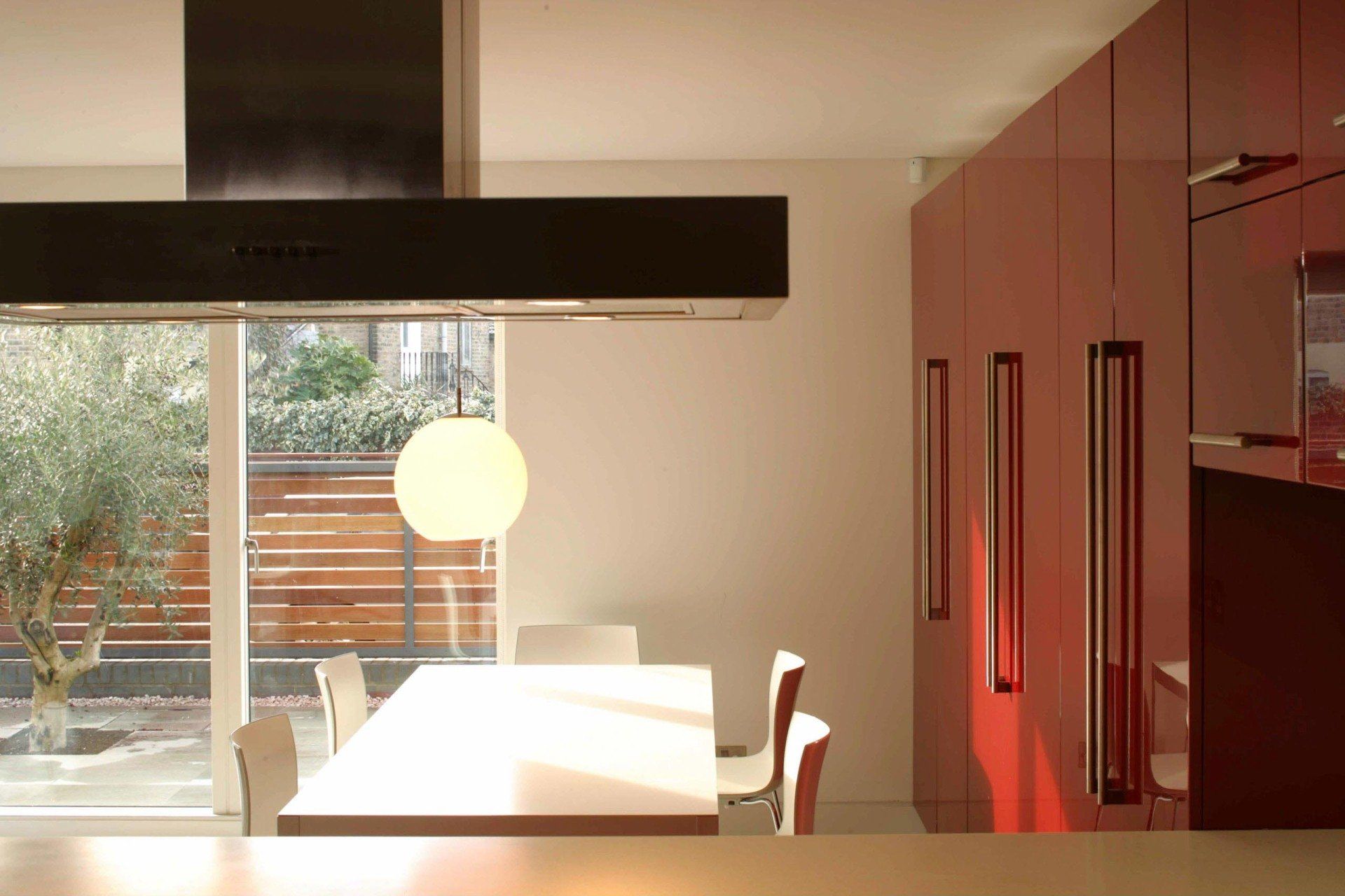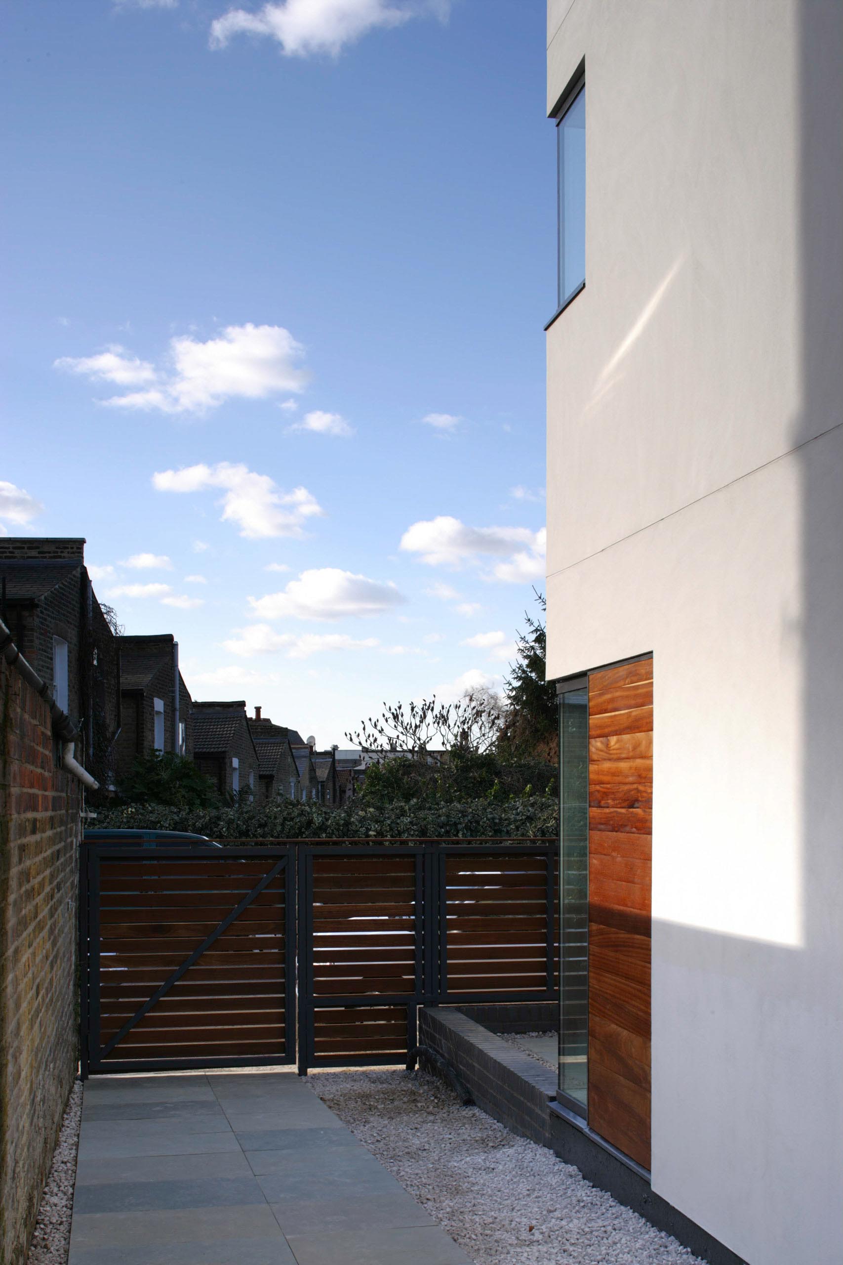 Materials were chosen to match with the neighbouring white rendered building but in a contemporary manner. The scale was to compliment the Victorian Terrace. Due to the small footprint of the site we required thin walls so we chose to construct the house from structural insulated panels (SIPs). The SIPs panels are clad with a recycled glass Verotec board followed by a Sto render. No steel beams are used and the house is a 100% timber construction, the majority of which is recycled. The construction was erected by a team of local builders in three weeks with the help of a mini-crane.