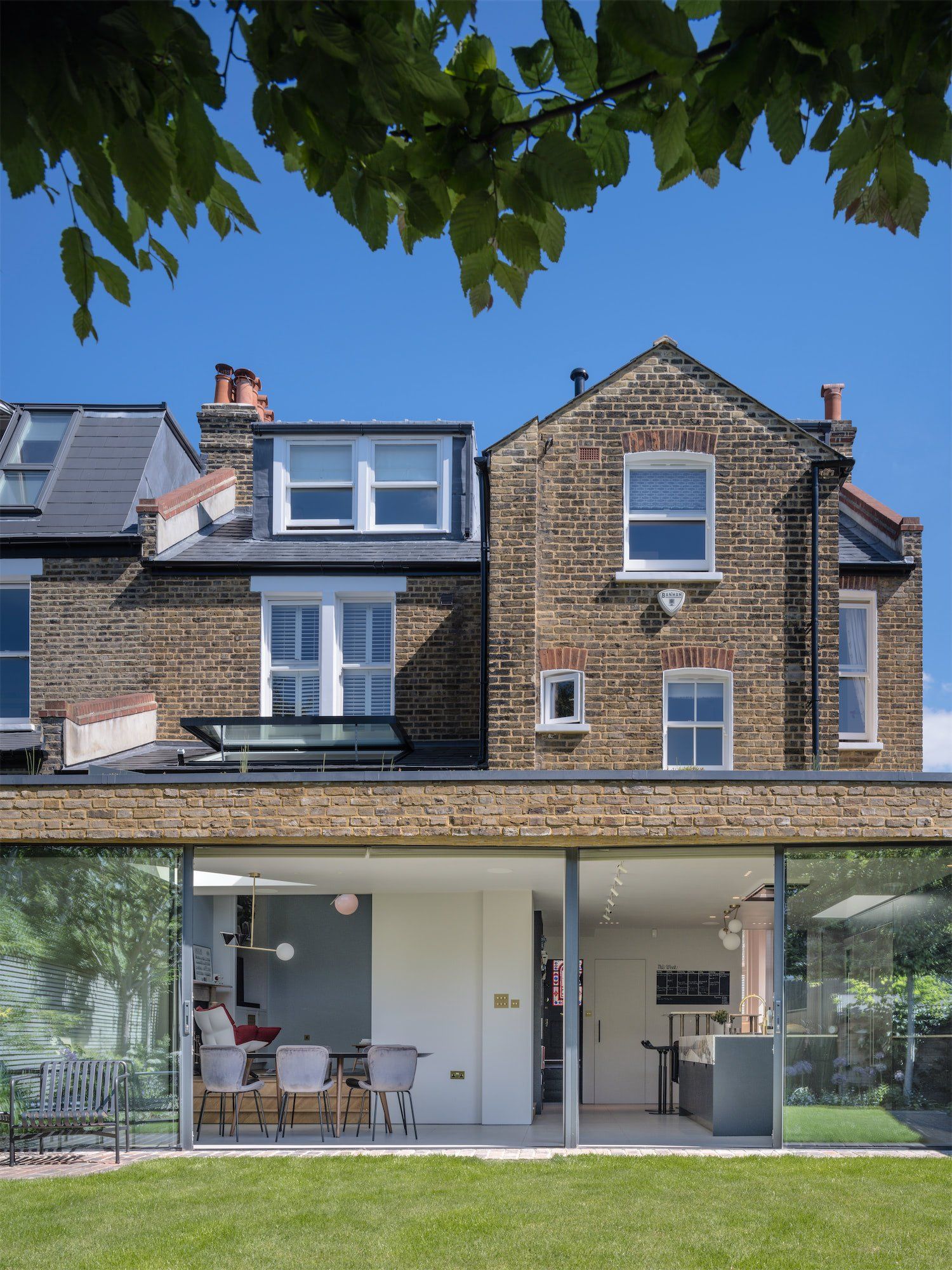 By extending the ground floor by 4 meters, the new kitchen/dining room now boasts ample natural light from new twin sliding doors and two triangular skylights.