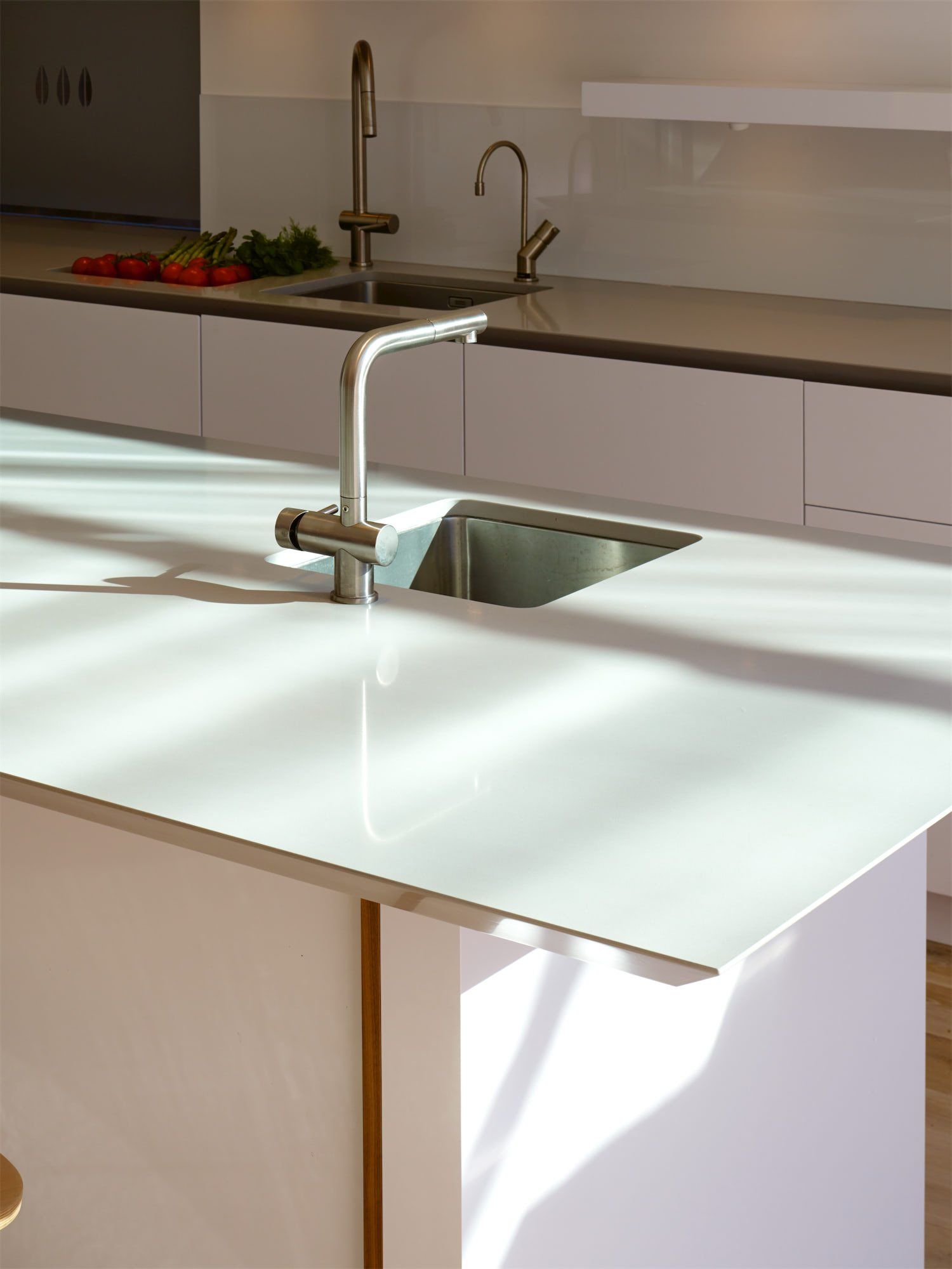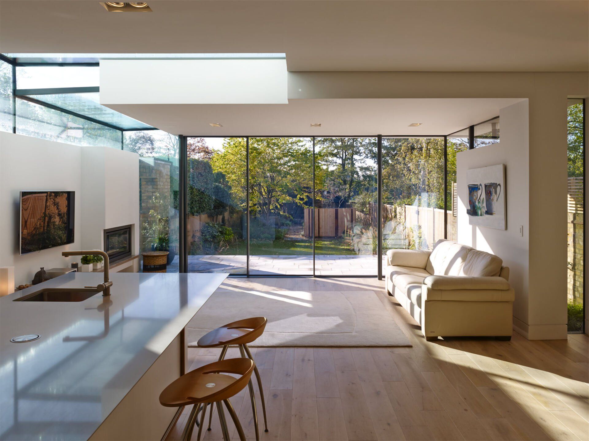 The interior was remodelled to create a sense of space and harmony, including the creation of a kitchen/family dining area with large skylights and sliding doors which serve to maximise solar gains in the winter. This space remains cool in the summer from the shading of the deep overhangs and roof light above the staircase, providing stack ventilation. Renewable elements incorporated into the refurbishment include a green roof, rain water harvesting system and a solar thermal panel. Further contemporary elements include an automation system, underfloor heating, media and lighting controls.