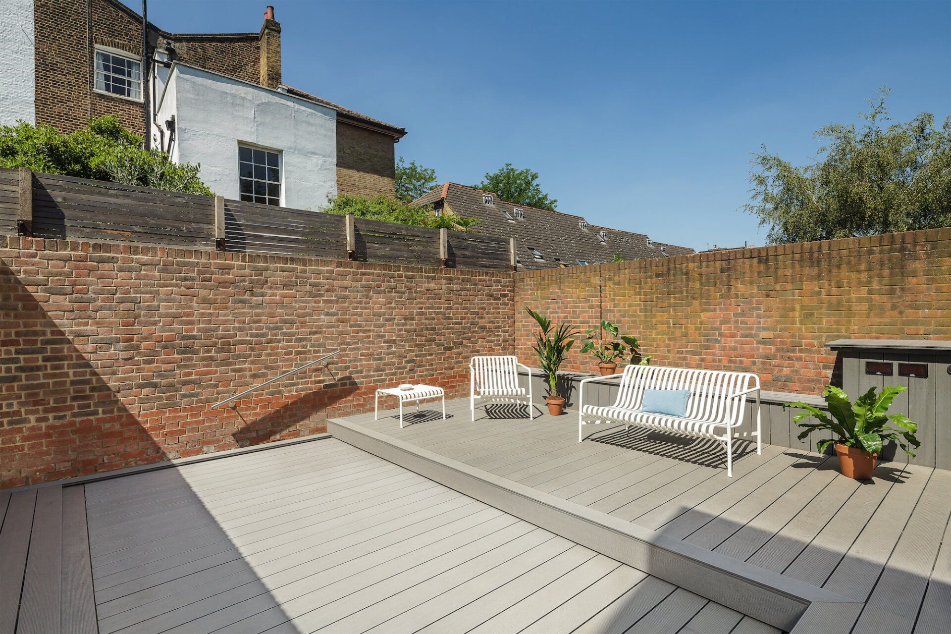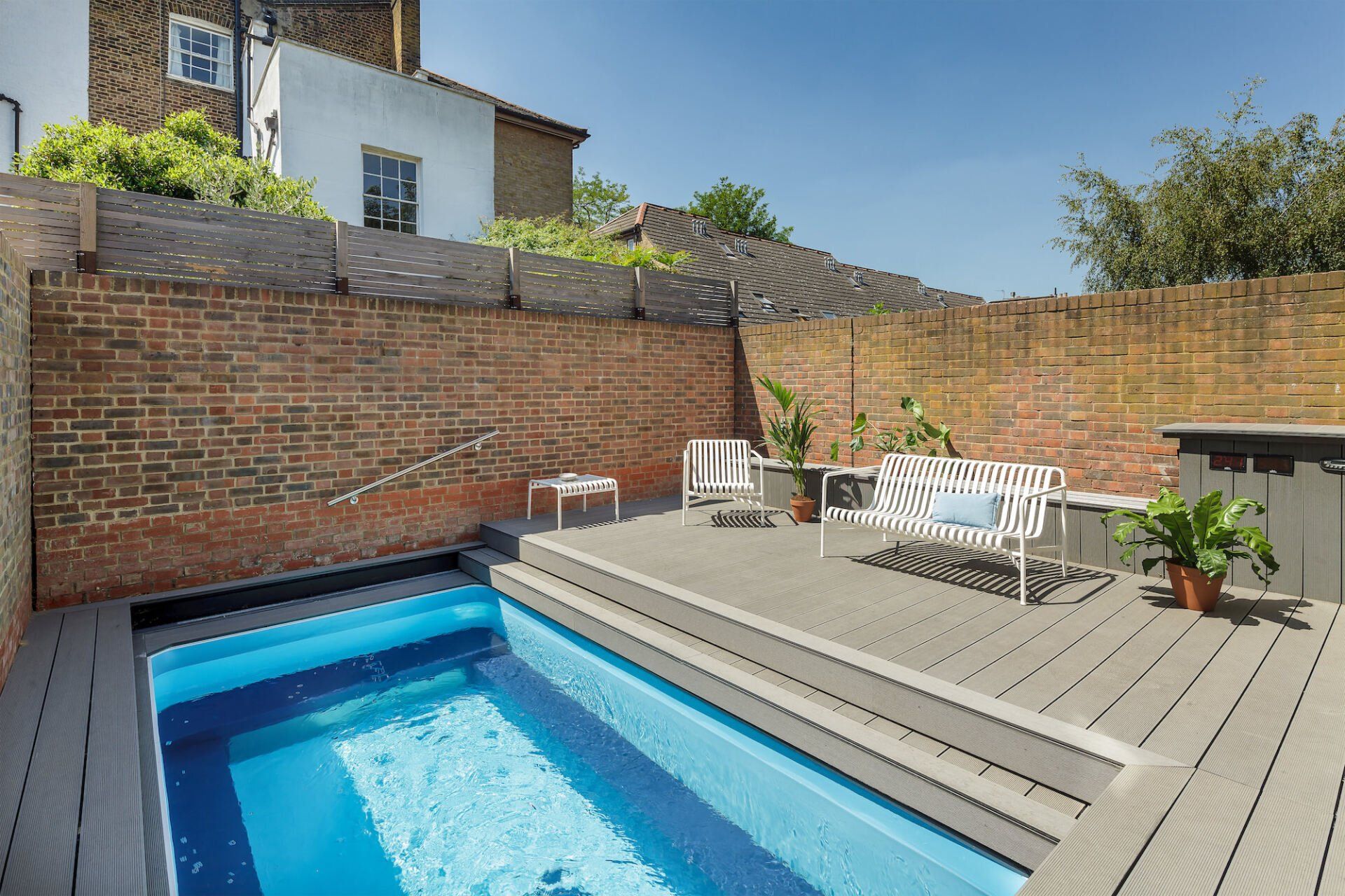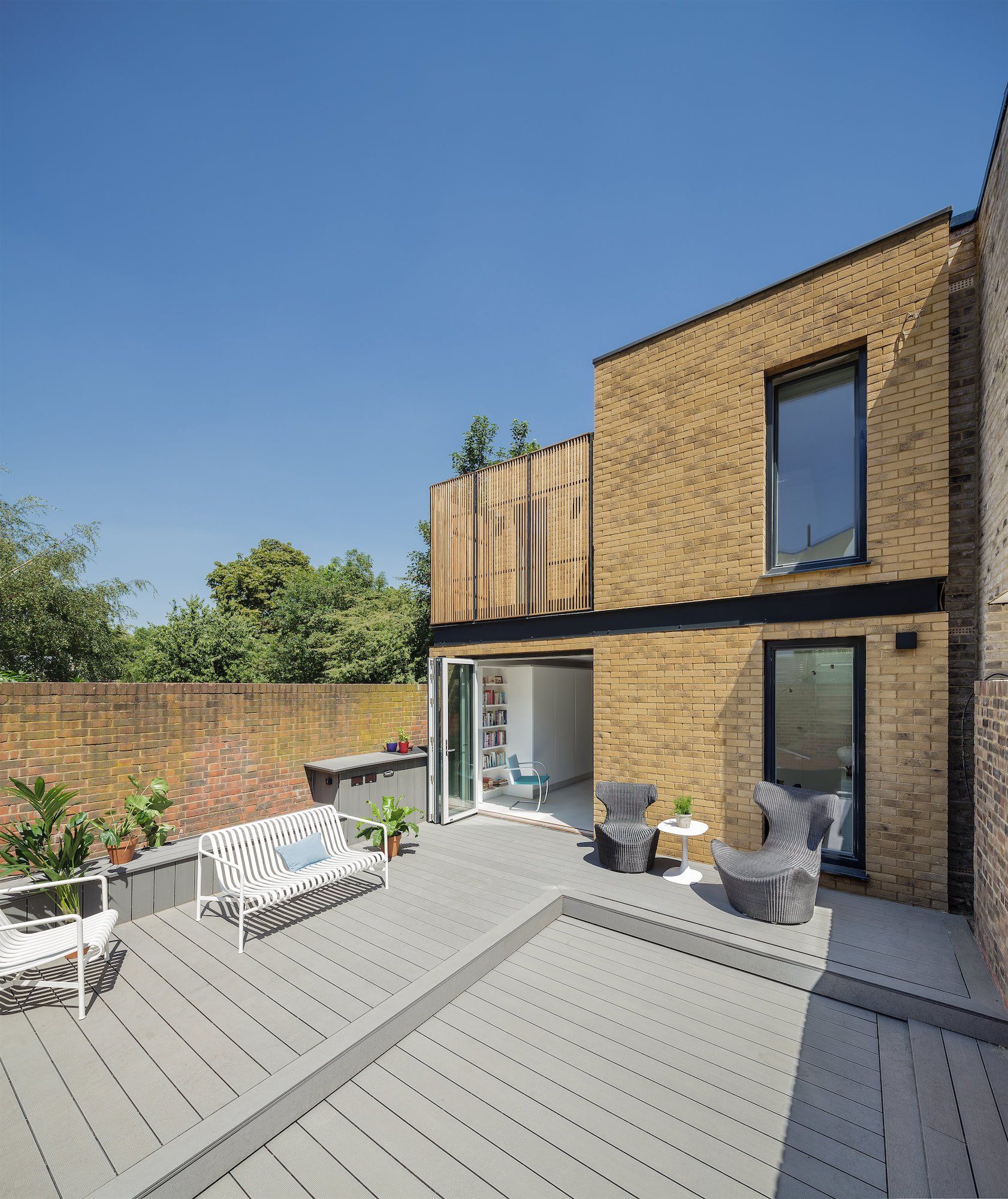 Maximising the outdoor amenity, the house offers a rear courtyard and a first-floor terrace, accessed off the master bedroom, which provides a more sheltered and private outdoor space. Standing in the courtyard, one flick of a switch starts to move the timber deck, which slides open to reveal a compact swimming pool underneath. The pool is electrically heated, which whilst is a significant consumer of energy, is almost completely offset by four large photovoltaic panels on the roof.