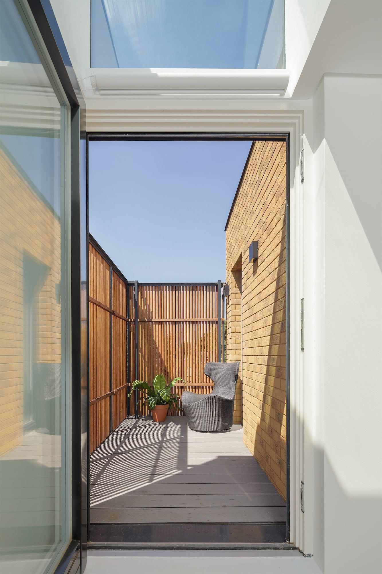 The overall design concept plays on the industrial service nature of the mews lane, maintaining a subservient presence to the town-houses behind it. The elevations use a combination of brick and steel that are softened with red cedar detailing. Chamfered timber soffits and slight variances in the brick depth bring lightness to the elevations that are animated with sun and shadow.