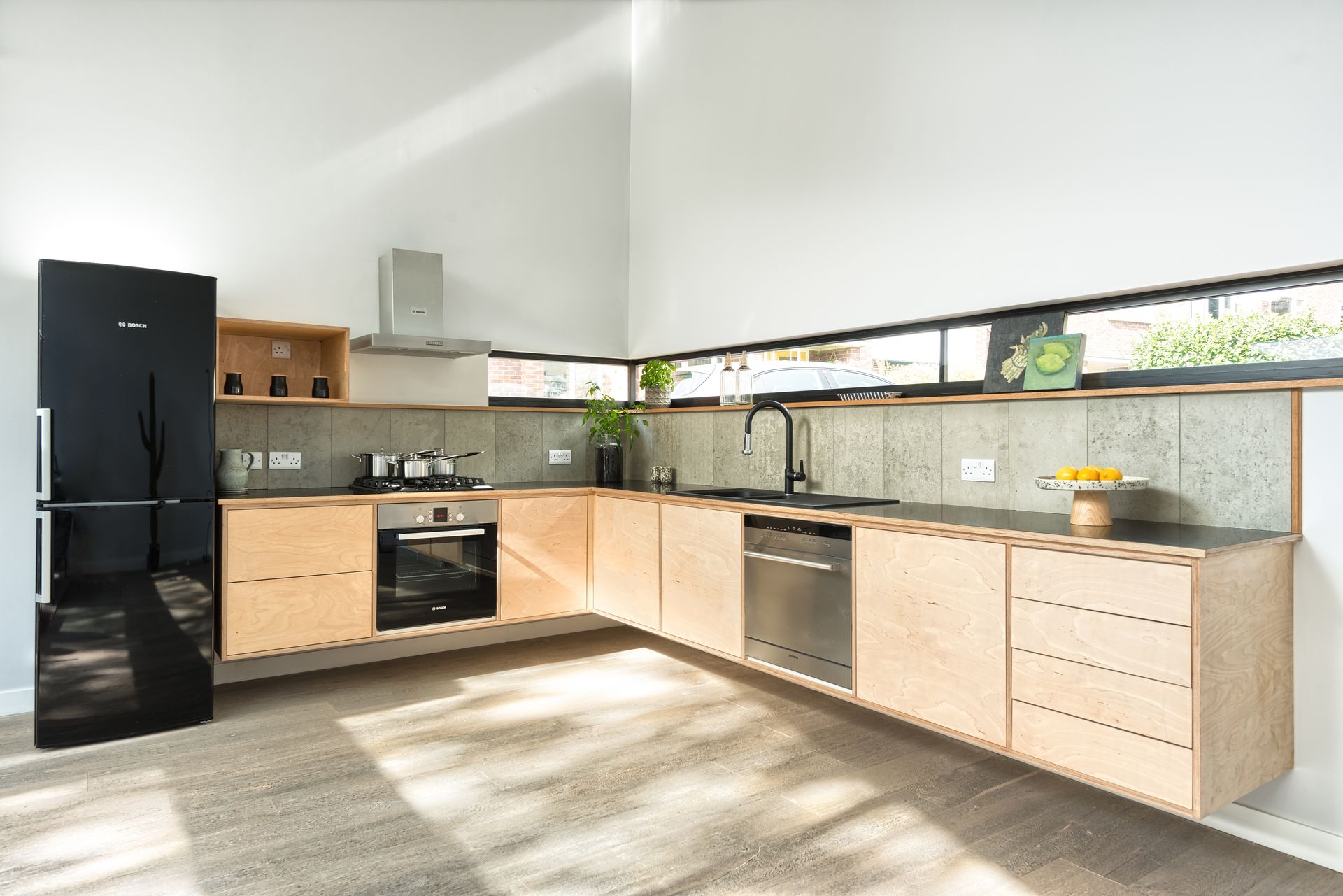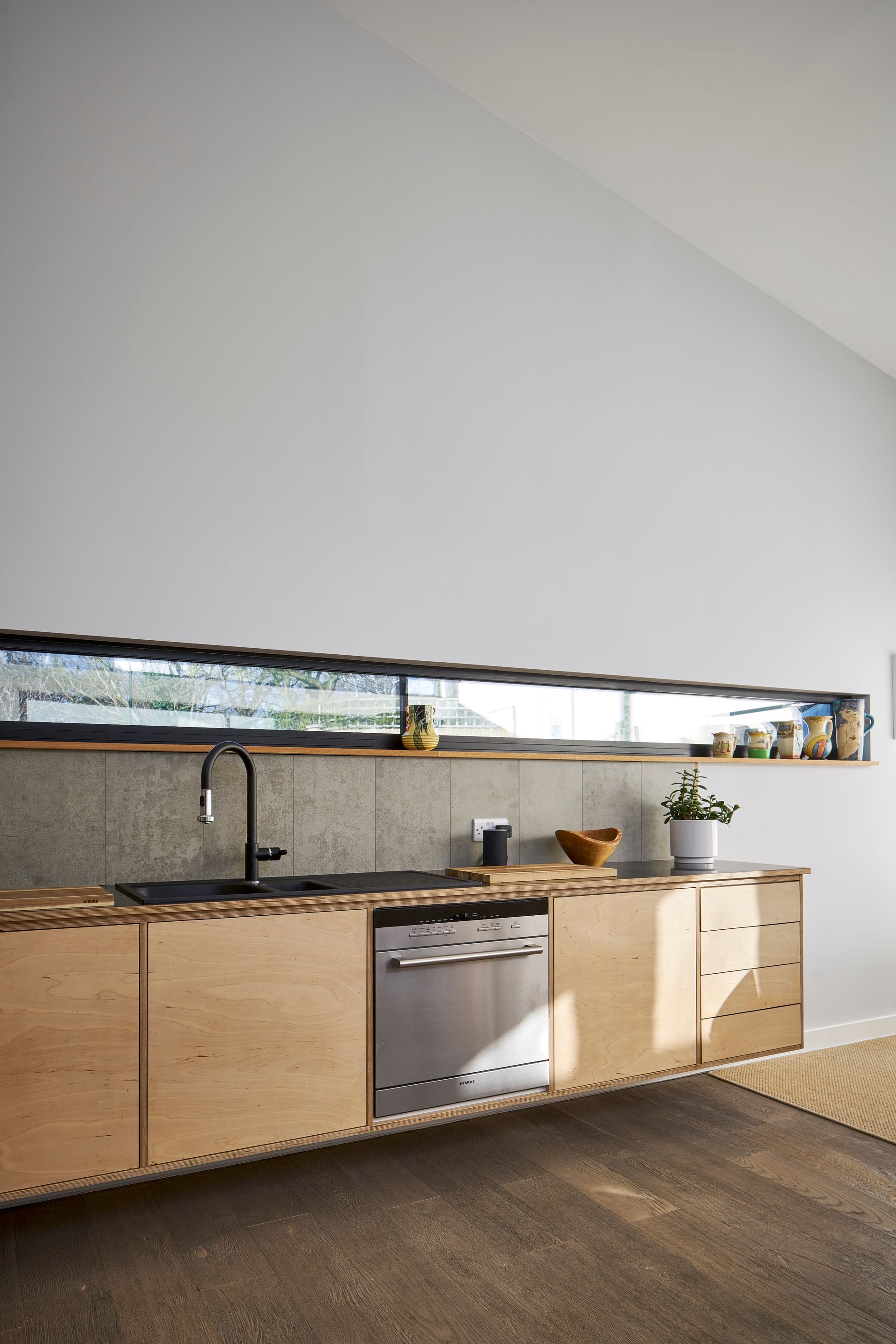 The inaccessibility of the site meant that modular construction was considered from the outset. Due to high land prices, offsite construction was also a way of controlling the budget. Being limited only by transport requirements, it was decided to split the house into seven modules. After an intensive groundworks programme, the modules were delivered to site and assembled in one day. The prefabrication went as far to include all glazing, joinery, kitchen, bathrooms and second fix elements, meaning that very little was left to do on site. All plumbing and electrics were contained within the modules too.