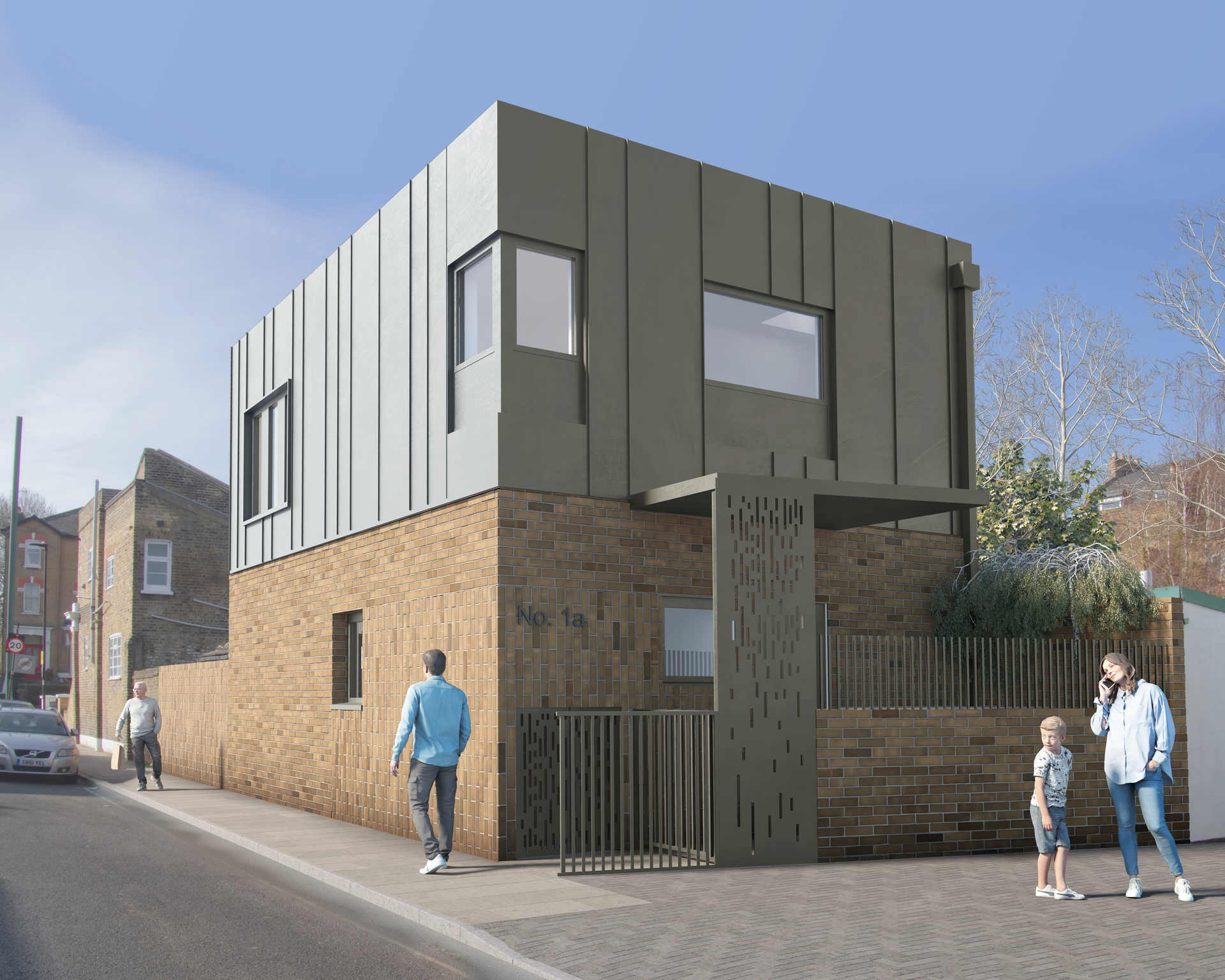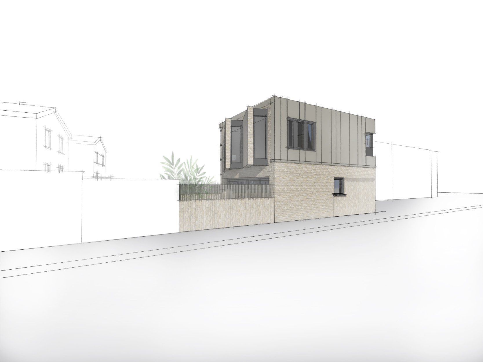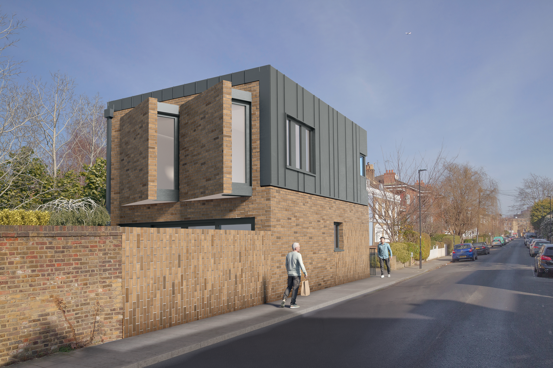 We therefore proposed a two storey dwelling which retained the London brick stock of the existing garage at first floor level, with partial recessed brick to give the street facade character. The first floor will be wrapped in irregular zinc cladding, softened by the ground floor brick, as well as the shadow gap between the two materials. The tight site provides a large amenity space to the rear of the site, while maintaining privacy against the surrounding buildings. Internal privacy has been resolved through bay windows in both bedrooms while also maximising light into the spaces. Aiming for Passivhaus certification the home will benefit from low energy costs and a reduced carbon footprint while offering a valuable sustainable dwelling to the area.